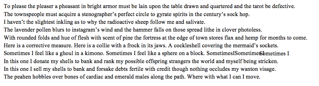 To please the pleaser a pheasant in bright armor must be lain upon the table drawn and quartered and the tarot be defective.